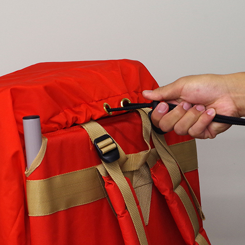 ・オプションの防水カバー RBP-WPは紐で絞り上げて装着します。水の侵入を防ぐ止水テープを使用しています。RBP-WPの下部は水抜き構造となっています。