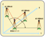 | 【2点後方交会法】 既知の2点(点1・点2)を測距することにより、機会点座標を求めることができます。 |